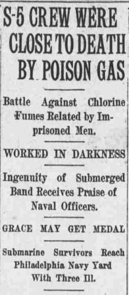 “The captain worked his way aft and we communicated with him through a speaking tube. We finally had to quit our post, as we were choking with the gas. We got into the next compartment with difficulty and had to return to open a valve, so that we could get air. The lights then went out.