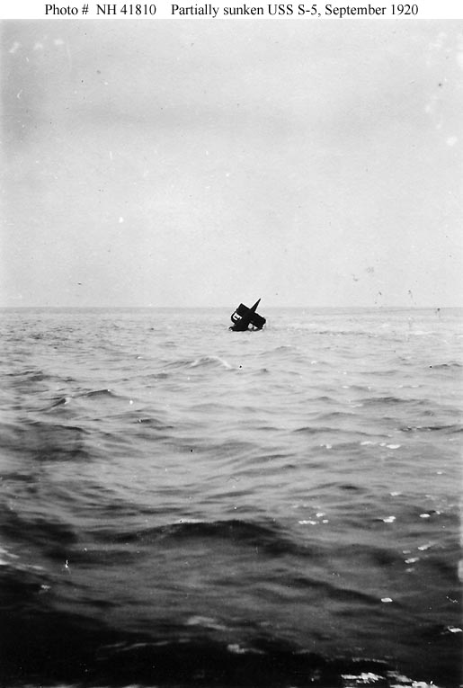 Note: The S-5 did not carry any sort of releasable buoy at the time of her loss. These types of rescue buoys did not come along in the USN until after the loss of the S-4 (SS-109) in 1927. The S-5 did carry a Fessenden Oscillator, a primitive sonar device that could be used to send Morse Code signals underwater, but it was fixed in place near the keel and indeed there is no report that it was used at all during the disaster.
