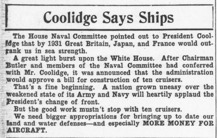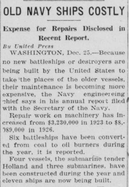 By the end of 1926, the military in general and the Navy in particular were feeling the strains of budget cuts and downsizing. The growing capacity of foreign navies was becoming an early alarm for how far behind our forces were becoming. In December, the behind the scenes pressure was gaining strength. The Roaring Twenties had not erased the global threats.