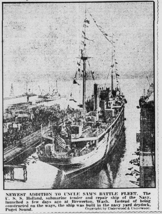 The U. S. S. Holland will join the Fleet as Submarine Repair Ship in March. This ship was built at the Navy Yard Bremerton, Washington and is named after the successful inventor of the underwater craft.