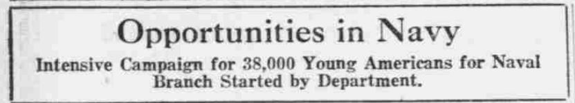 “The Navy this week is beginning an intensive campaign for recruits. Thirty-eight thousand young Americans are wanted to put on the blue uniform and be trained into artisans, machinists, aviators, gunners, radiomen, torpedo-men, electricians, clerks, submarine-men, and the other vocations necessary to the operation of Uncle Sam’s fighting ships and the naval shore establishments From now on for many weeks the recruiting offices will be busy enlisting young men who elect to take advantage of the undoubted opportunities which the navy offers them.