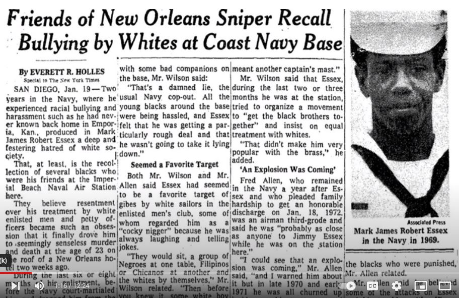 Mark James Robert Essex (August 12, 1949 – January 7, 1973) was an American serial sniper and black nationalist known as the “New Orleans Sniper” who killed a total of nine people, including five policemen, and wounded twelve others in two separate attacks in New Orleans on December 31, 1972 and January 7, 1973.