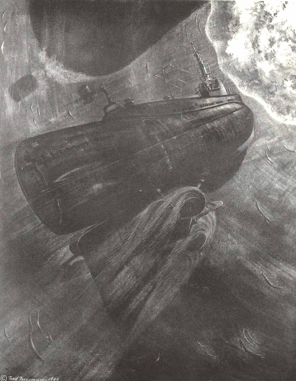 Guardfish (SS-217) gets a “going over”. Underwater explosion forms huge bubble and sends out percussion waves. Blast close aboard could crush pressure hull. Here the sub sustains a near miss. On same patrol, Guardfish watched a Honshu horse-race, sank 4 ships in a day, scored one of the wars longest torpedo shots. Drawing by Lt. Cmdr. Fred Freemen, courtesy of Theodore Roscoe, from his book “U.S. Submarine Operations of WW II”, published by USNI.
