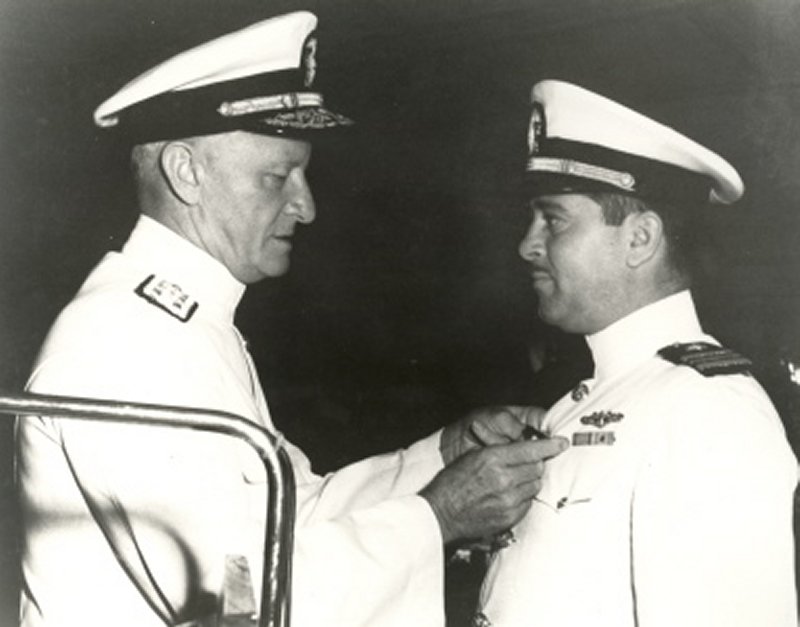 Admiral Nimitz, Commander-in-Chief, US Pacific Fleet, presents the Navy Cross to LCdr Thomas B. Klakring, Commanding Officer of Guardfish (SS-217).