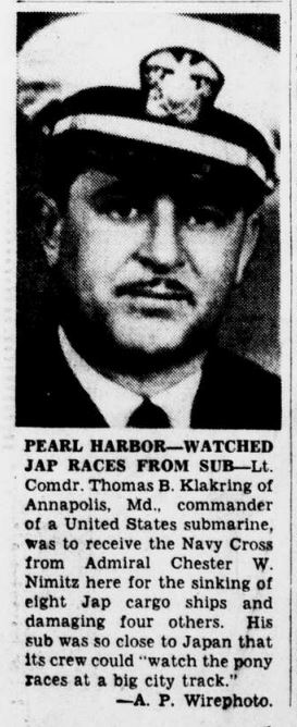 PEARL HARBOR—WATCHED JAP RACES FROM SUB Lt. Comdr. Thomas B. Klakring of Annapolis, Md„ commander of a United States submarine, was to receive the Navy Cross from Admiral Chester W. Nimitz here for the sinking of eight Jap cargo ships and damaging four others. His sub was so close to Japan that its crew could “watch the pony races at a big city track.”