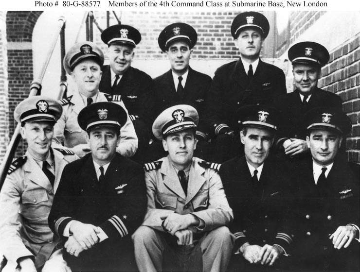 U.S. Naval Submarine Base, New London, Groton, Connecticut: Members of the 4th Command Class at the Submarine Base, February 1942. Those present are, bottom row left to right: Lieutenant Commander Mannert L. Abele; first command would be the Grunion (SS-216). He would be K.I.A. while commanding the Grunion, 30 July 1942. Lieutenant Commander Thomas B. Klakring; first command would be the Guardfish (SS-217), Commander Karl G. Hensel, Officer in Charge; Lieutenant Commander George W. Patterson, Jr., Senior Assistant; and Lieutenant Commander Jesse L. Hull; first command would be the Finback (SS-230). Top row, left to right: Lieutenant Commander Howard W. Gilmore; first command would be the Growler (SS-215). He was posthumously awarded the Medal of Honor after he was K.I.A. on the bridge of the Growler, 7 February 1943. Lieutenant Commander Philip H. Ross; first command would be the Halibut (SS-232), Lieutenant Commander Arthur H. Taylor; first command would be the Haddock (SS-231), Lieutenant Commander Albert C. Burrows; first command would be the Swordfish (SS-193) and Lieutenant Commander Leonard S. Mewhinney; first command would be the Saury (SS-189).