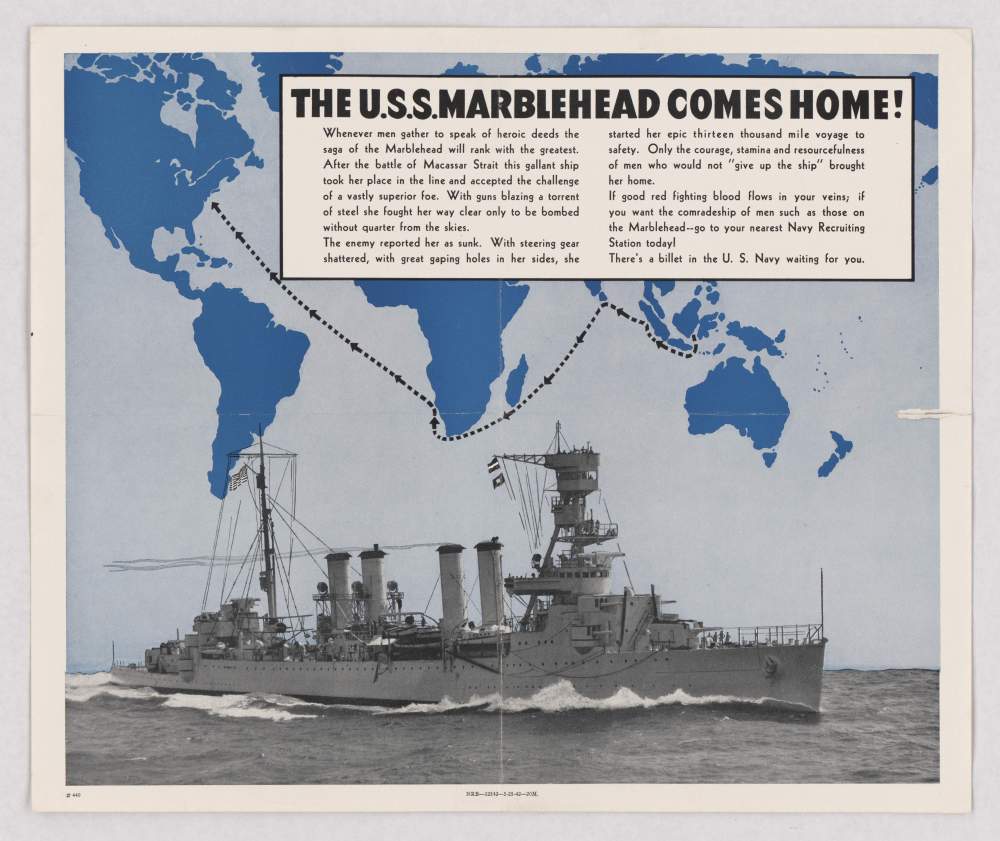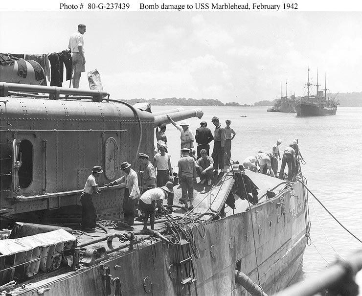 Marblehead’s engineers soon released the rudder angle to 9- left, and at 1255 she retired to Tjilatjap, steering by working the engines at varying speeds. She made Tjilatjap with a forward draft of 30 feet, aft 22 feet. Unable to be docked there, her worst leaks were repaired and she put to sea again on the 13th, beginning a voyage of more than 9,000 miles in search of complete repairs.