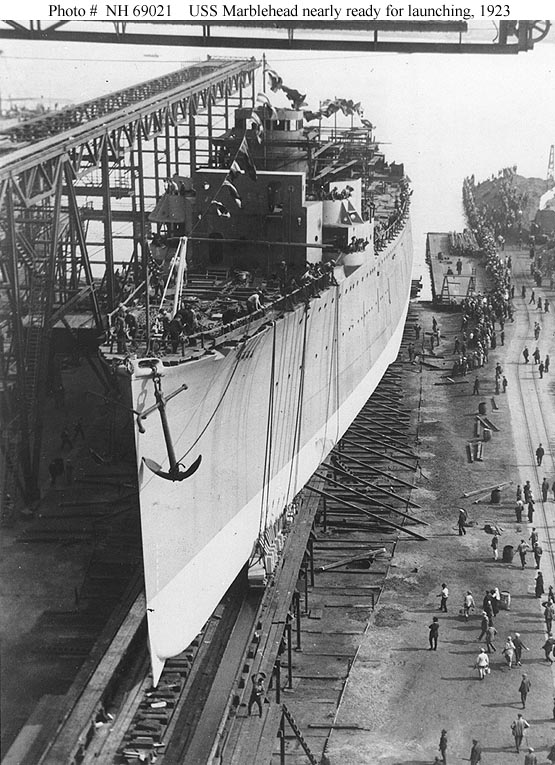 The USS Marblehead (CL-12) was an Omaha-class light cruiser, originally classified as a scout cruiser, of the United States Navy. She was the third Navy ship named for the town of Marblehead, Massachusetts. She was launched on October 9, 1923 shortly after the US Navy was committed to the disastrous Naval Arms Limitation Treaty that would have a major impact on the ability of our Navy to meet the challenges of World War 2 in the pacific.