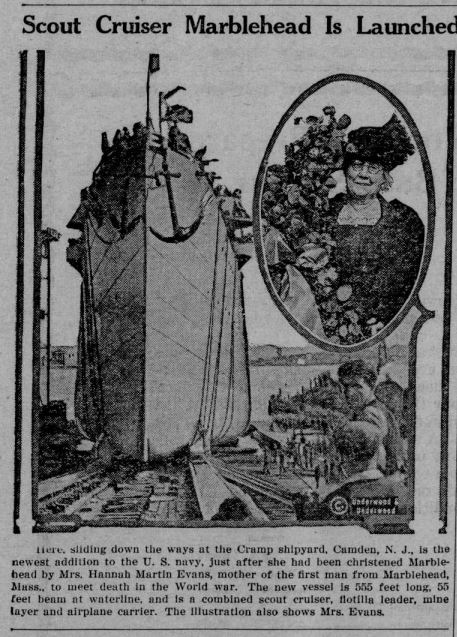 PHILADELPHIA, October 9.—One of Uncle Sam’s fleetest fighting craft, the cruiser Marblehead, will slip from the ways at Cramp’s shipyard at high tide today. She will be sponsored by Mrs. Hannah Martin Evans, first gold star mother of Marblehead, Mass. More than forty ranking naval officers will attend the ceremonies.