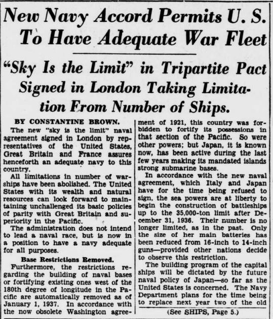 “Non-Japanese experts said that because the British and Americans have not built up to treaty strength, while the Japanese have, Japan already possesses a modem, underage fleet of considerably greater strength than the treaty 5—5—3 relations.”