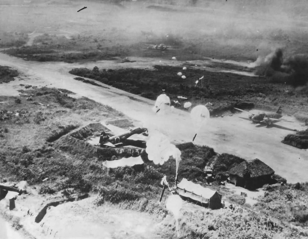 SOUTHWEST PACIFIC THEATER OF OPERATIONS (Fifth Air Force): Allied aircraft begin a major air offensive against Rabaul, with the aim of isolating and neutralizing it. Almost 350 B-24’s, B-25’s, P-38’s, and RAAF airplanes pound the town, harbor, and airfields in the area, including B-25D Mitchells from 345th BG that conduct the first low level para-frag bomb attack against Vunakanau Airfield.