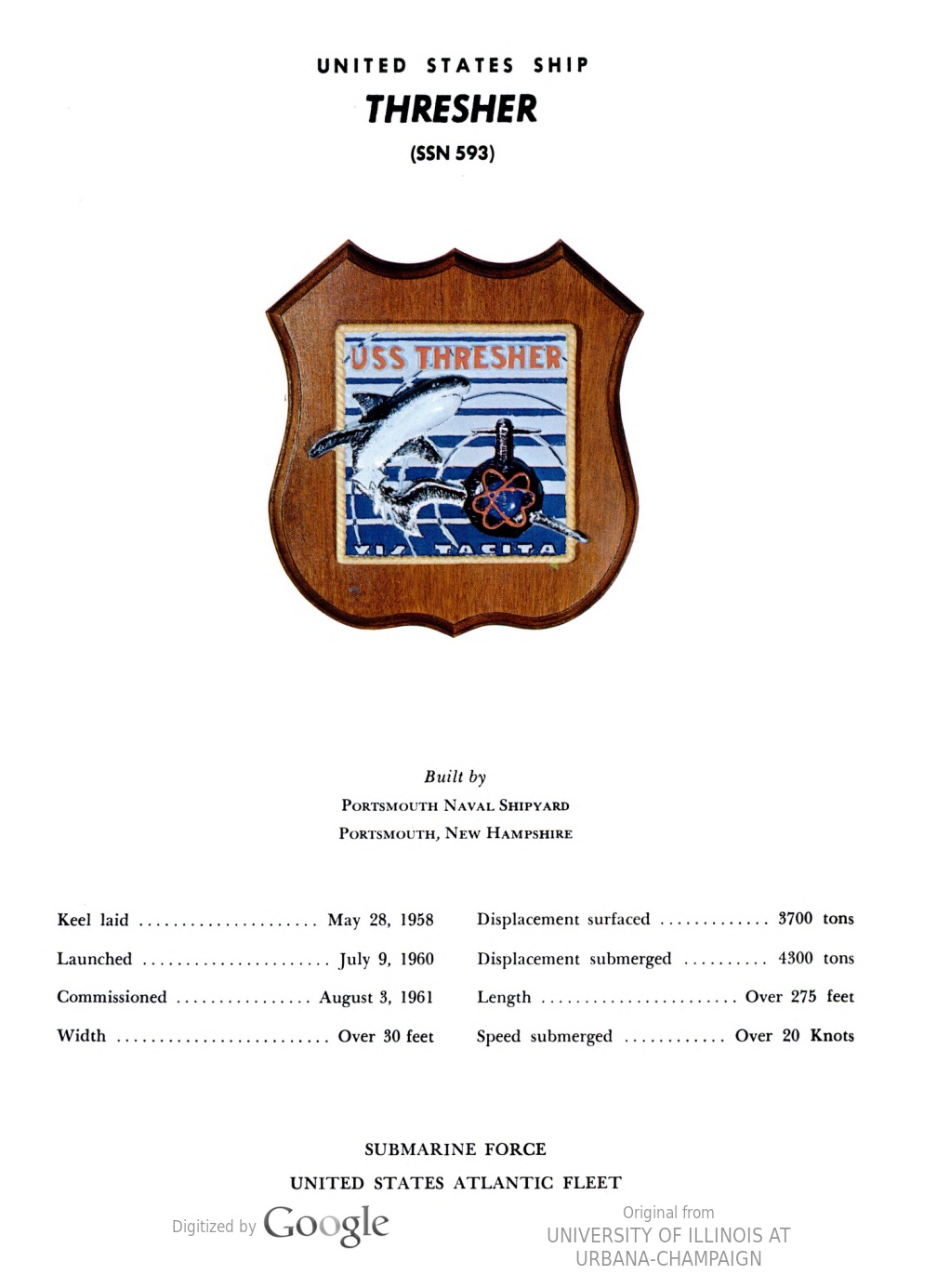 “The nuclear attack submarine Thresher sank in 8,400 feet of water off the New England coast during trials following her post-shakedown availability on 10 April 1963. At the time she went down, the Navy had no organization, no search techniques, and no specific procedures for mounting a deep-ocean search and identification operation. The response to the casualty, however, was immediate. Within a few hours, a full – scale search effort with thirteen ships had been laid on to seek any signs of life from Thresher. After some twenty hours, all hope of finding survivors had passed. The operation changed from a search and rescue operation to an ad hoc oceanographic effort under Captain Frank A. Andrews to locate the wreck of the submarine. The Navy had an intense interest in deter- mining the cause of the loss for the same reasons it had had in the loss of F – 4 nearly fifty years before. If the cause of the disaster could be identified, it could be eliminated in other submarines.