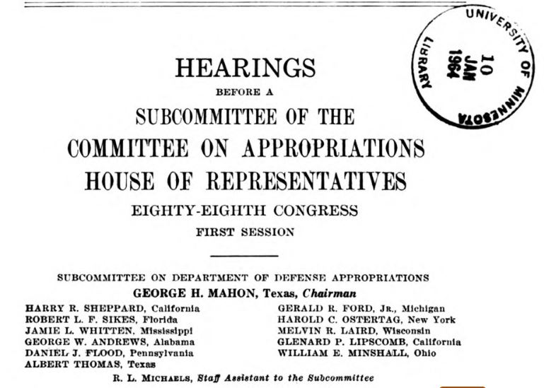 Department of Defense appropriations for 1964; statement of Hyman G. Rickover, contracting procedures, nuclear powered navy. Hearings before a subcommittee of the Committee on Appropriations, House of Representatives, Eighty-eighth Congress, first session. There are a few really familiar names that someday would become familiar for many different reasons. I will highlight a few of them in read in the article.
