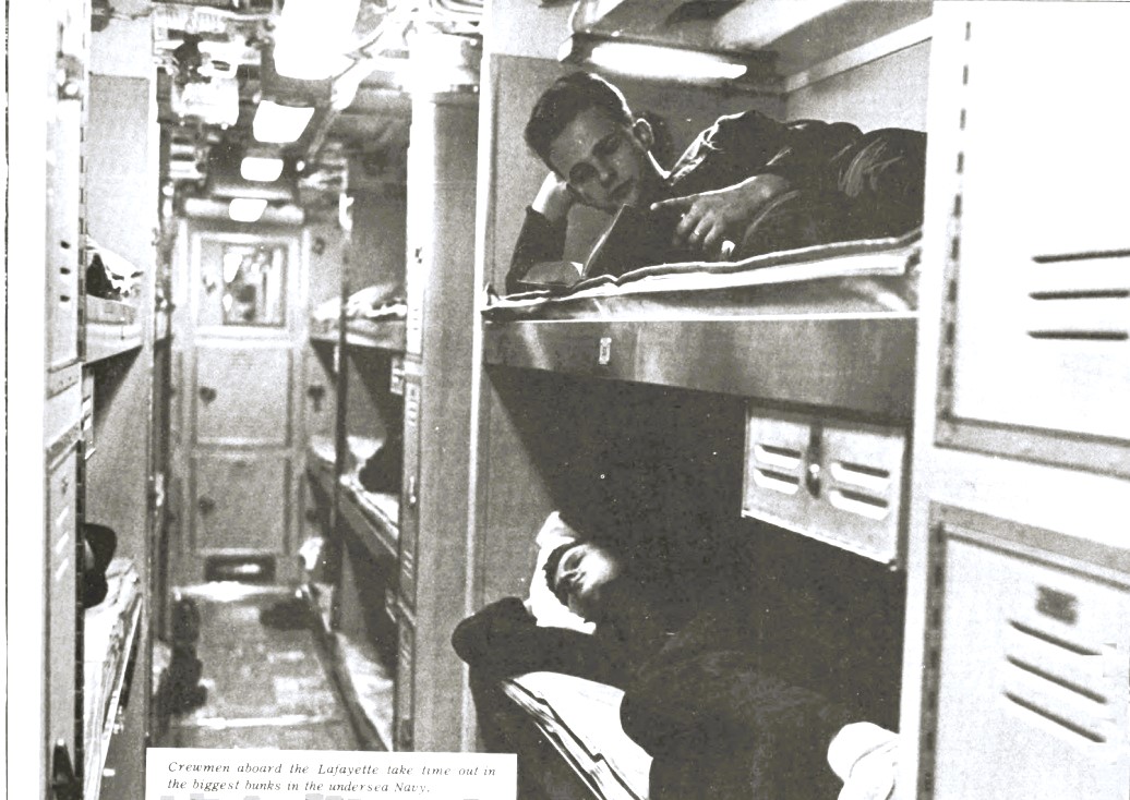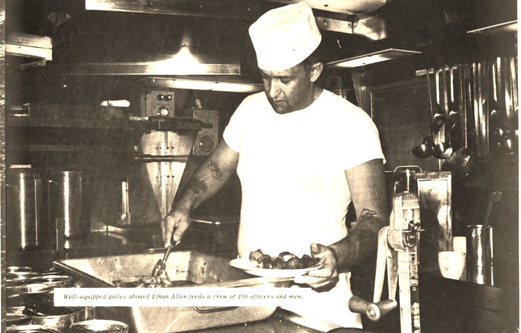 Submariners are among the Navy’s best fed, but pity the cook. During the course of an average Polaris patrol, the Lafayette’s cooks will prepare about 23,500 meals in a galley 9 x 15 feet. By contrast, a housewife cooks 5,475 meals per year for a family of five.
