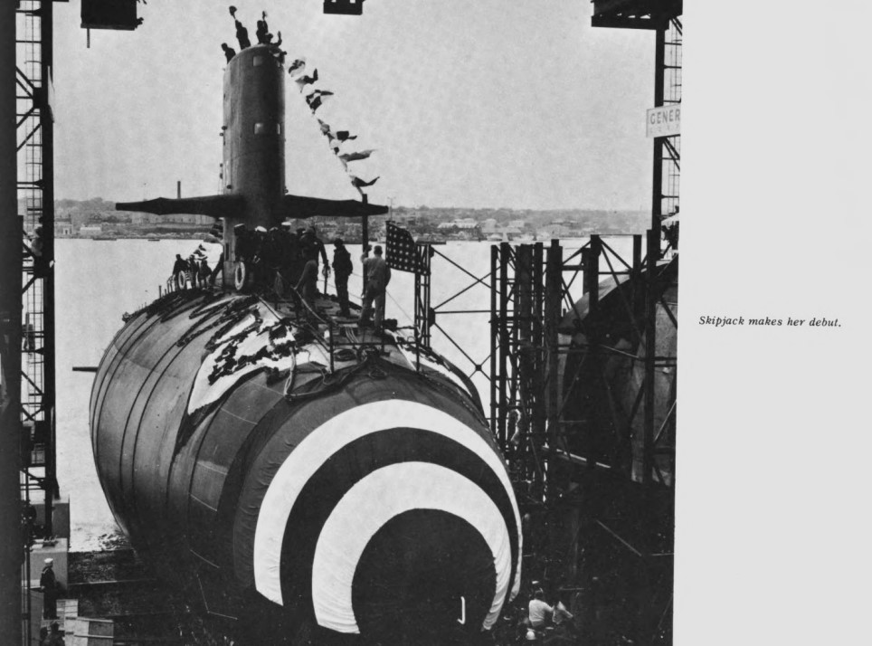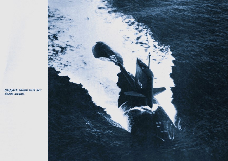 The USS Skipjack, radically different and speedier than any predecessor submarine, was the first of a new generation of fighting ships. Skipjack marks important milestones in many areas of research and development. Her blunt-nosed, football-shaped hull is in itself an important development-used for the first time in a combat ship. The adoption of this hydrodynamically superior hull shape, devoid of all superstructure, makes it possible for her efficient, nuclear power plant to give her the highest submerged speeds yet attained.