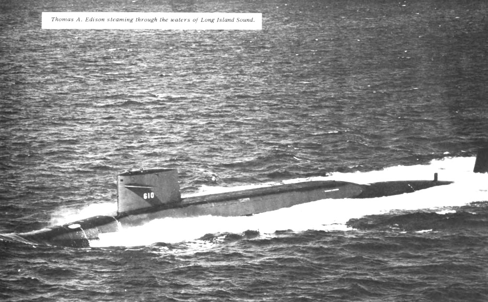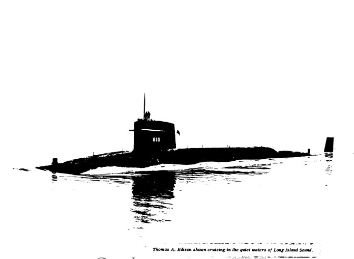 The USS Thomas A. Edison is 410 feet long and displaces 6,900 tons. She is powered by a nuclear reactor and carries equipment unknown a few years ago, such as an inertial navigation system which enables the ship’s position to be determined with pin-point accuracy.