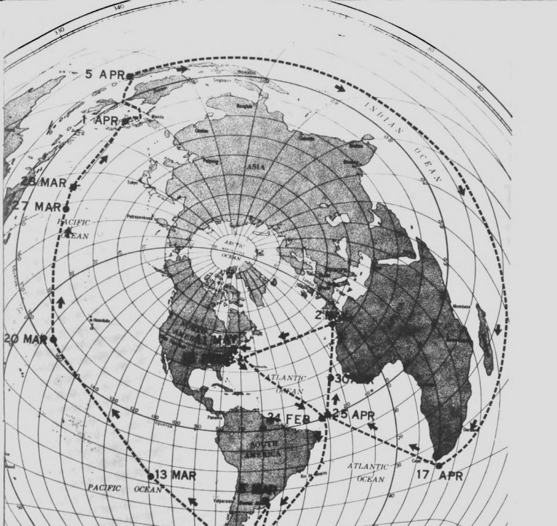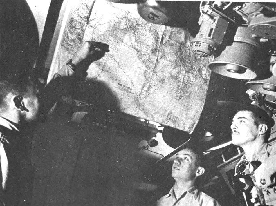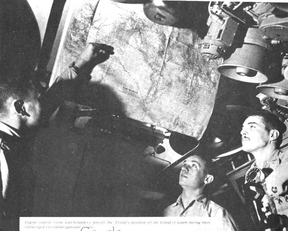 Course followed by the Triton, one of the world’s largest submarines, on her shakedown cruise in which she circumnavigated the globe submerged. Significant points in her itinerary, as shown on the chart were: