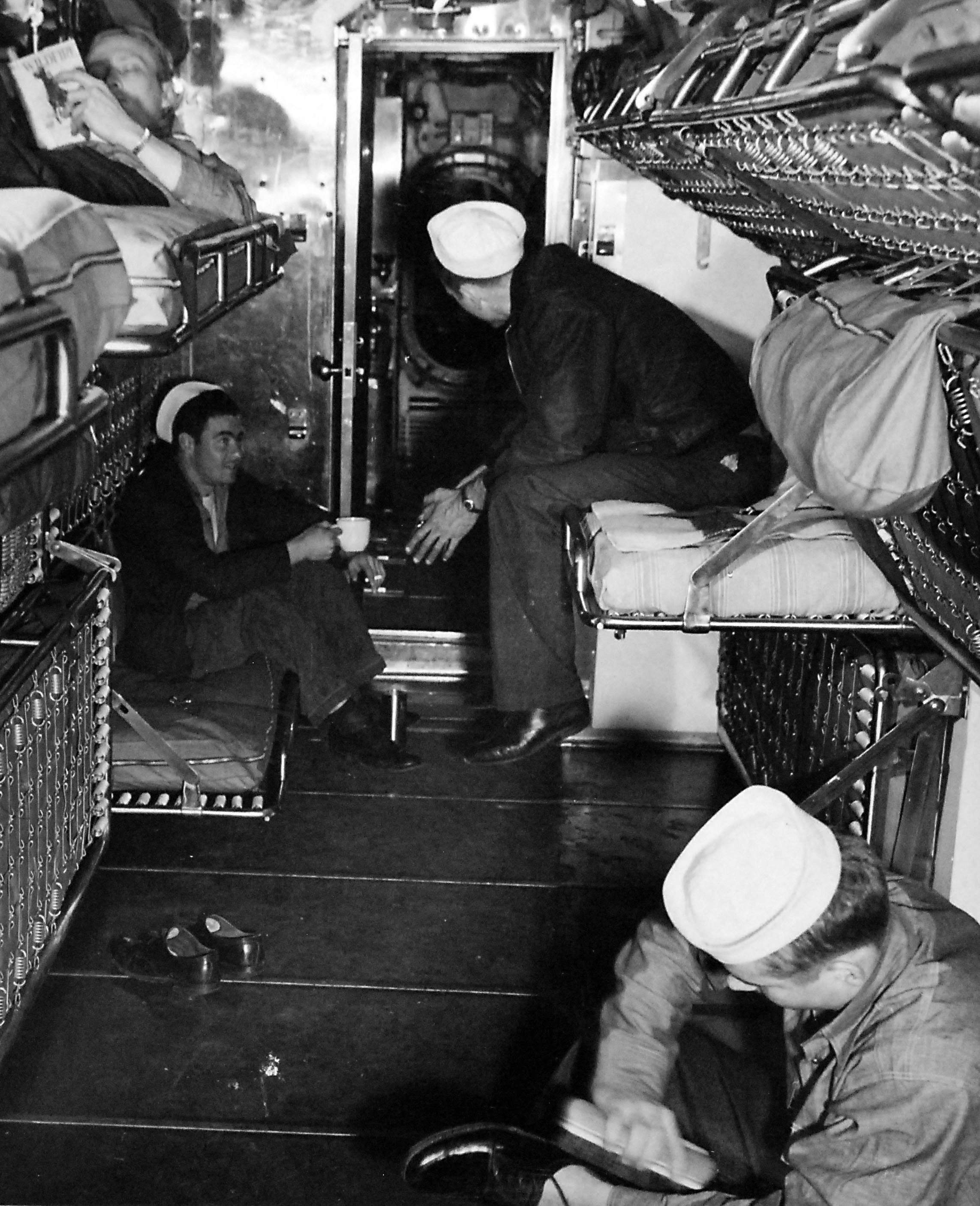 The class of ships had numerous crew comforts including showers, air conditioning, refrigerated storage for food, generous freshwater distilling units, clothes washers, and bunks for nearly every crew member; these were luxuries virtually unheard of in other navies. The bureau designers felt that if a crew of 60–80 men were to be expected to conduct 75-day patrols in the warm waters of the Pacific, these types of features were vital to the health and efficiency of the crew. They could be added without impact to the ship’s war fighting abilities due to the extra room of the big fleet ship.