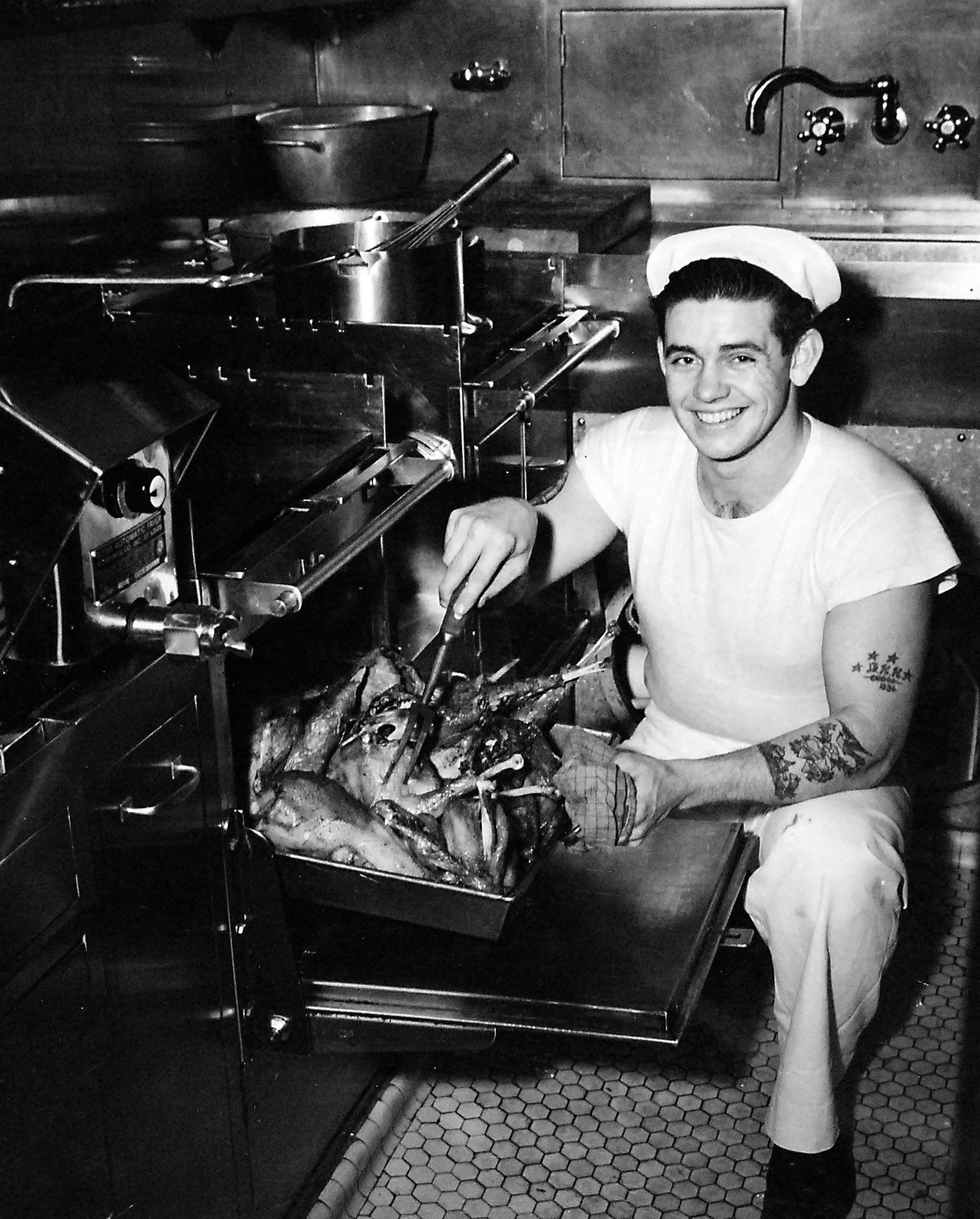 The ship’s cooks got sore at the enginemen for the chintzy water supply and at the electricians for the bulb and fan snatching and began to prepare exotic meals such as baked stuffed sardines and a few other highly indigestible dishes.