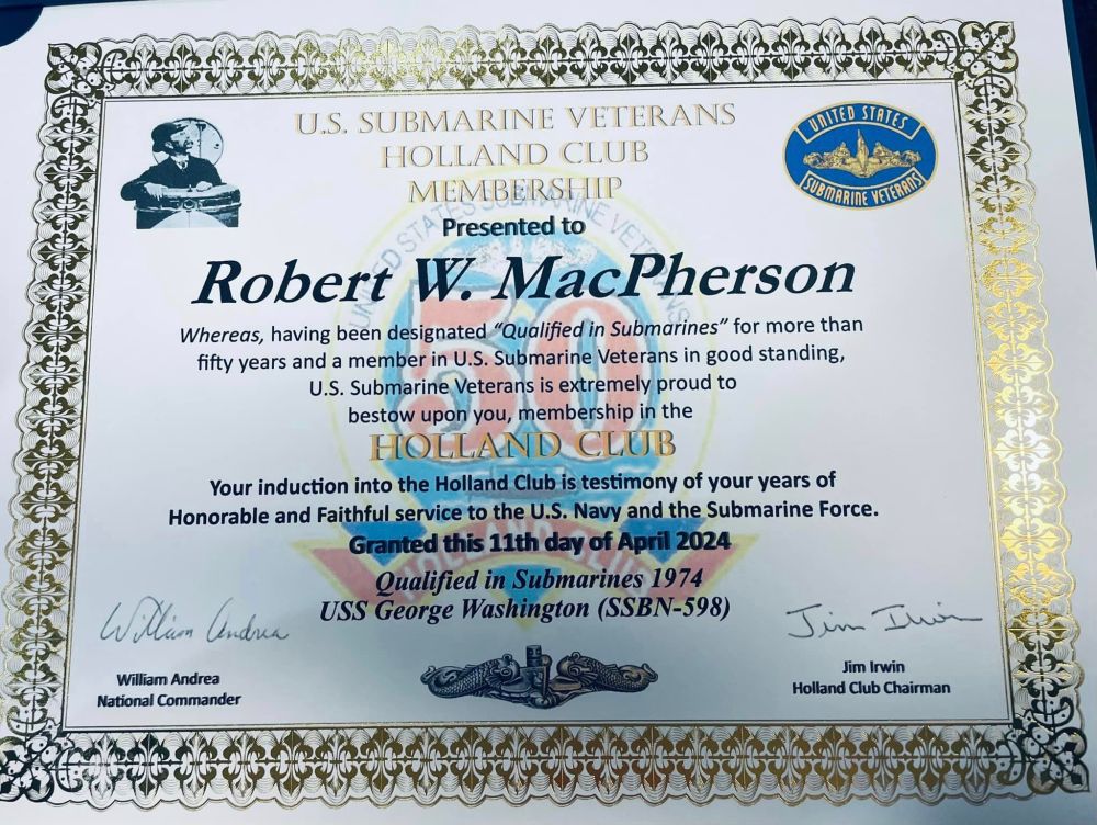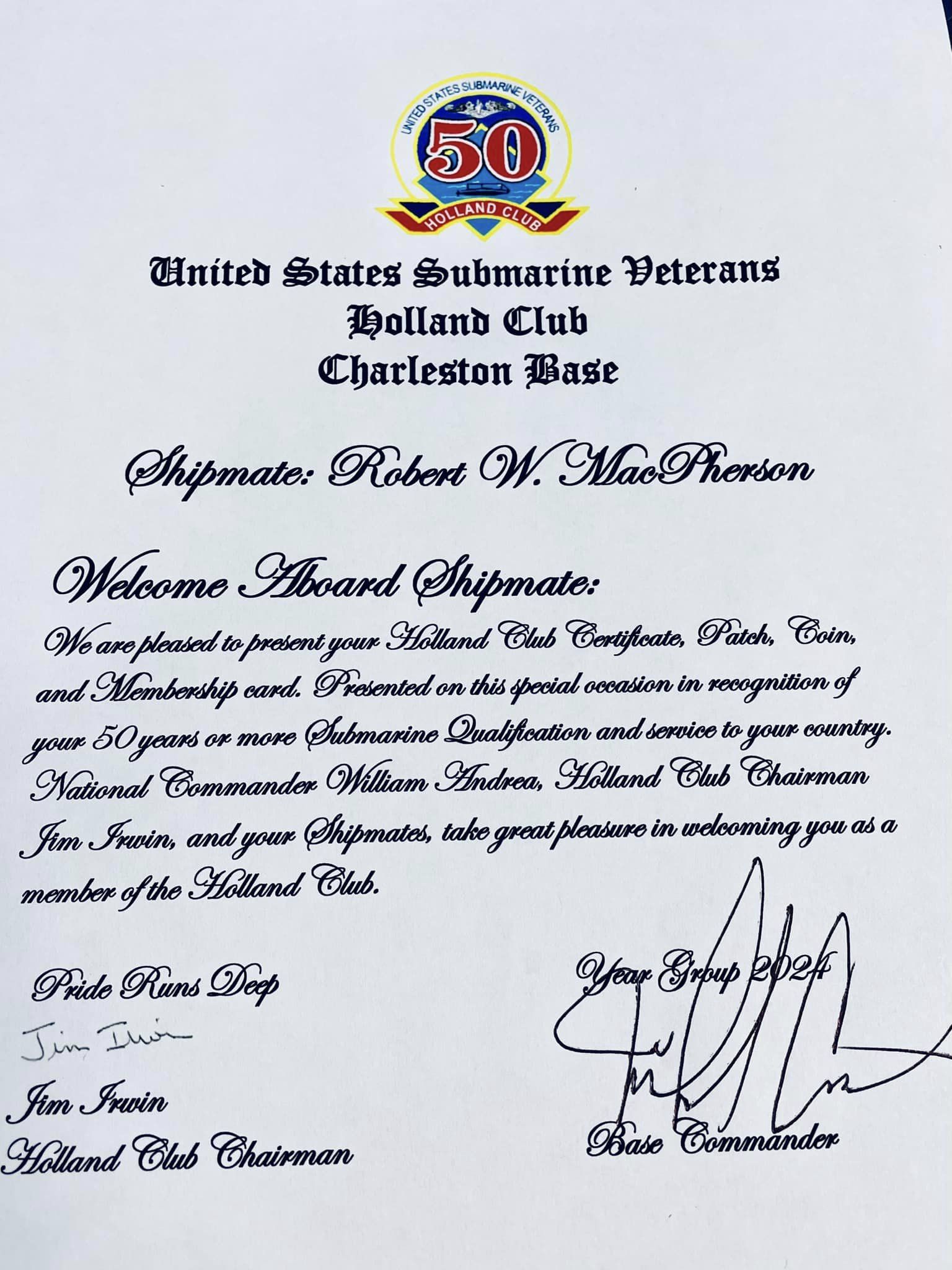I was honored to have my wife and my Submariner Brothers present last night at the USSVI Charleston Base to see my induction into the Holland Club.