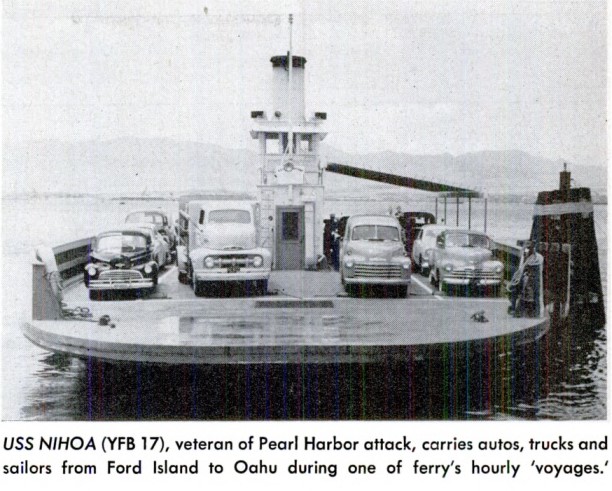 Caption: USS NIHOA (YFB 17) , veteran of Pearl Harbor attack, carries autos, trucks and sailors from Ford Island to Oahu during one of ferry’s hourly ‘ voyages. ‘