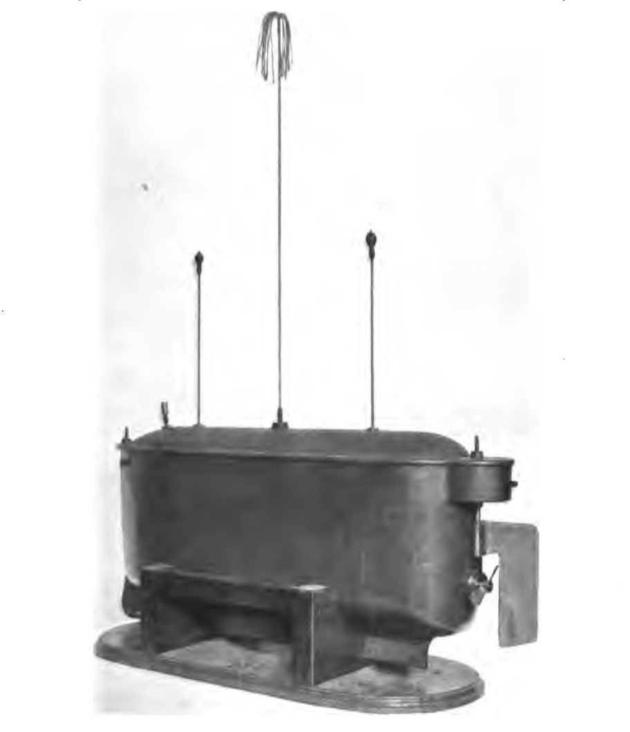“Having explained to you some of the possibilities of the device,” continued Mr. Tesla, “I will now give you a practical example of the workings of the model before going into a detailed description of how I am able to produce these results.” Elevated on stocks on a table in the center of the laboratory stood a model of a screw propelled craft about four feet long and somewhat disproportionately wide and deep. Mr. Tesla explained that it was merely a working model which he had had made in order to exhibit to President McKinley and that no attempt had been made to follow the usual sharp lines of a torpedo boat. The deck was slightly arched and surmounted by three slender standards, the center one being considerably higher than the other two, which carried small incandescent bulbs, a third bulb being fixed at the bow. The keel consisted of a massive copper plate, the propeller and rudder being in the usual positions. Mr. Tesla explained that the boat contained the propelling machinery, consisting of an electric motor actuated by a storage battery in the hold; another motor to actuate the rudder and the delicate mechanism which performs the function of receiving through the central standard the electric impulses sent through the atmosphere from the distant operating station, which set in motion the propelling and steering motors, and through them light or extinguish the electric bulbs and fire the exploding charge in a chamber in the bow in response to signals sent by the operator.