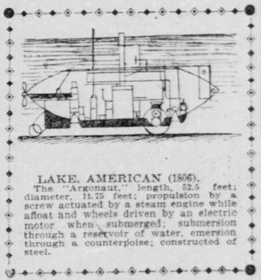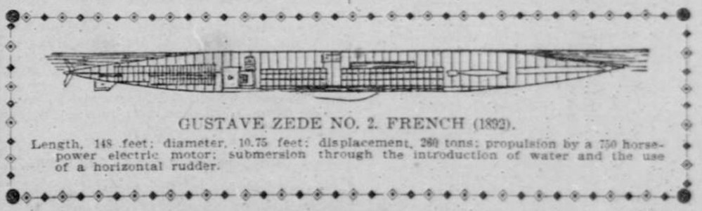 Submergence is accomplished principally by the admission of water into tans arranged for the purpose. This is in some cases supplemented by vertical screws by horizontal rudders or vanes. A boat in motion may be made to go under the water by changing the angle of the horizontal vanes, but if the forward motion should cease, the boat without water ballast would rise to the surface again. Any boat which depends on the use of vanes for submergence is more properly a diving or plunging boat. Several of the modern boats can be steered in this way, among them those of Nordenfelt, Zede, Peral and Holland. In the Goubt, Baker and Tuck boats the angle of the propellers can be changed, thus changing the course. An-other ingenious method of submergence is by a change in volume, which may be accomplished by the use of watertight pistons. This, however. Is only a particular way of admitting water ballast. Although much popular enthusiasm has recently been aroused in France by the performances of two or three boats, we may leave them without further description and pass at once to the consideration of the boats which have the most interest for us – those of Holland and of Lake.