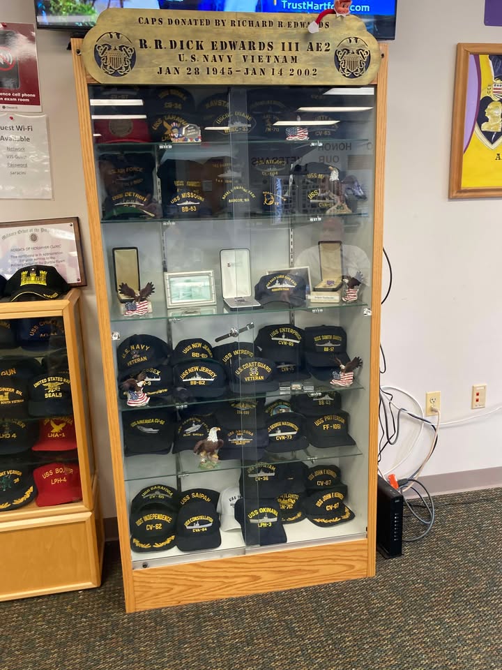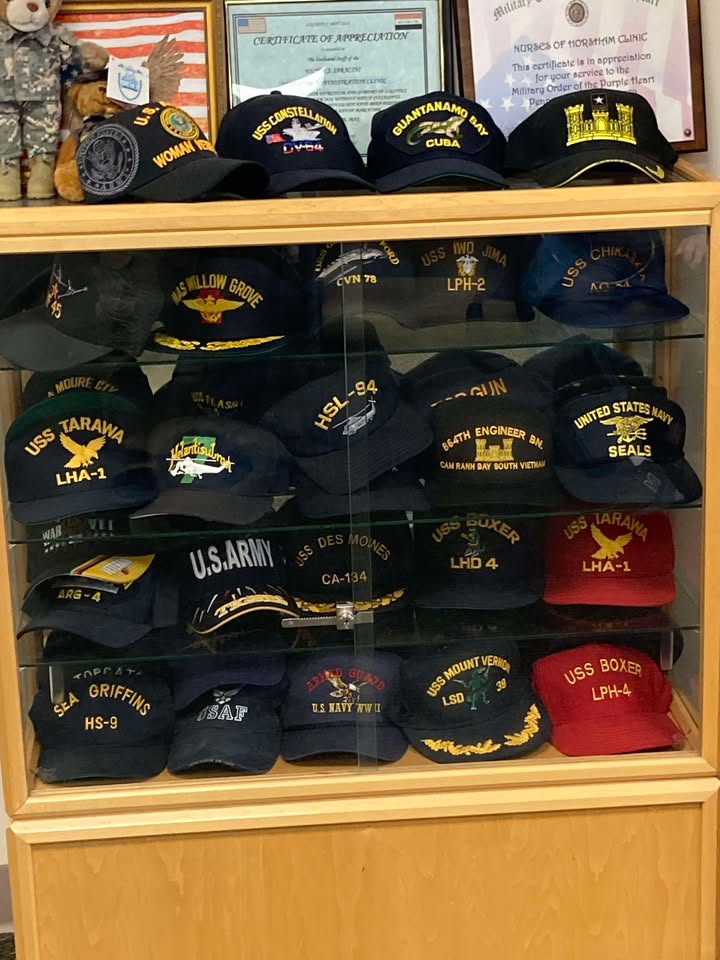Apparently, my addiction to hats is not just mine. Shortly after I published the original note, I got a note on my Facebook account from a fellow veteran (John Lutz) about a unique display at the Willow Grove PA VA Clinic that features hats.