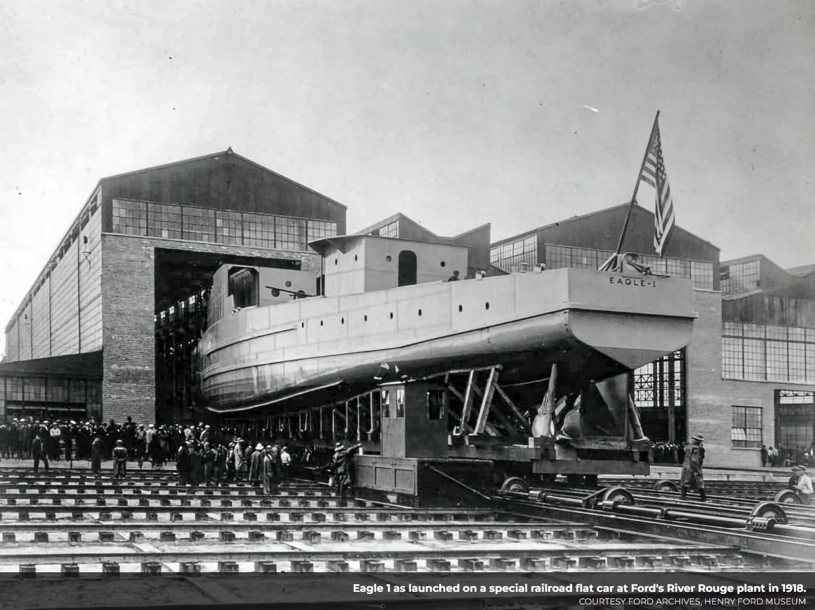 Commander Robert Stocker, under the capable direction of Admiral P. W. Taylor, worked out the hull design, while Commander S. M. Robinson, in close association with Admiral R. S. Griffin and Admiral Dyson, designed the power plant. Henry Ford’s particular contribution to the design was limited to his suggestion that the Navy use steam turbines instead of reciprocating engines. He also suggested the use of flat hull plates so as to be able to take full advantage of mass production methods.