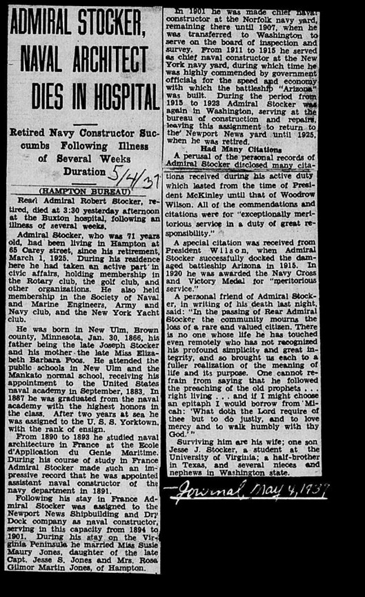Admiral Stocker has been one of the outstanding figures of the Navy’s construction corps. He holds the Navy Cross for distinguished service. Admiral Stocker retired las November, but was kept in service until yesterday. He was born in New Ulm, Minn., January 1866.