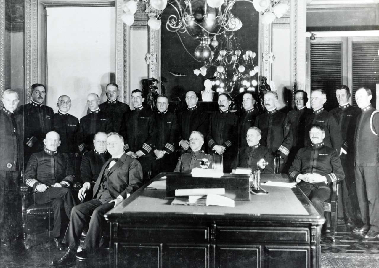Caption: Seated left to right: Admiral Henry T. Mayo, Admiral Hugh Rodman, Honorable Josephus Daniels, Secretary of the Navy, Major General George Barnett USMC, Captain William V. Pratt, Admiral Robert E. Coontz. Standing left to right: Rear Admiral William C. Braisted, Rear Admiral Victor Blue, Captain H.H. Christy, Captain Frederic B. Bassett, Captain Charles B. McVay, Jr., Captain Louis M. Nulton, Captain James H. Dayton, Rear Admiral Samuel J. McGowan, Captain Robert Stocker, Rear Admiral Ralph Earle, Rear Admiral Charles W. Parks, Captain Elisha Theall, Rear Admiral J.S. McKean, Commander Percy W. Foote, and Commander Frank B. Freyer.