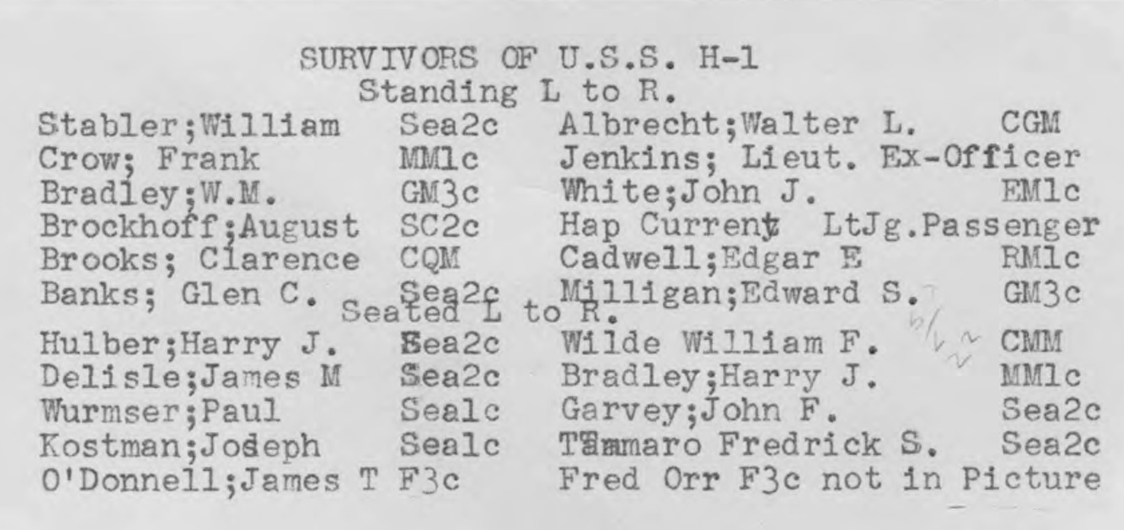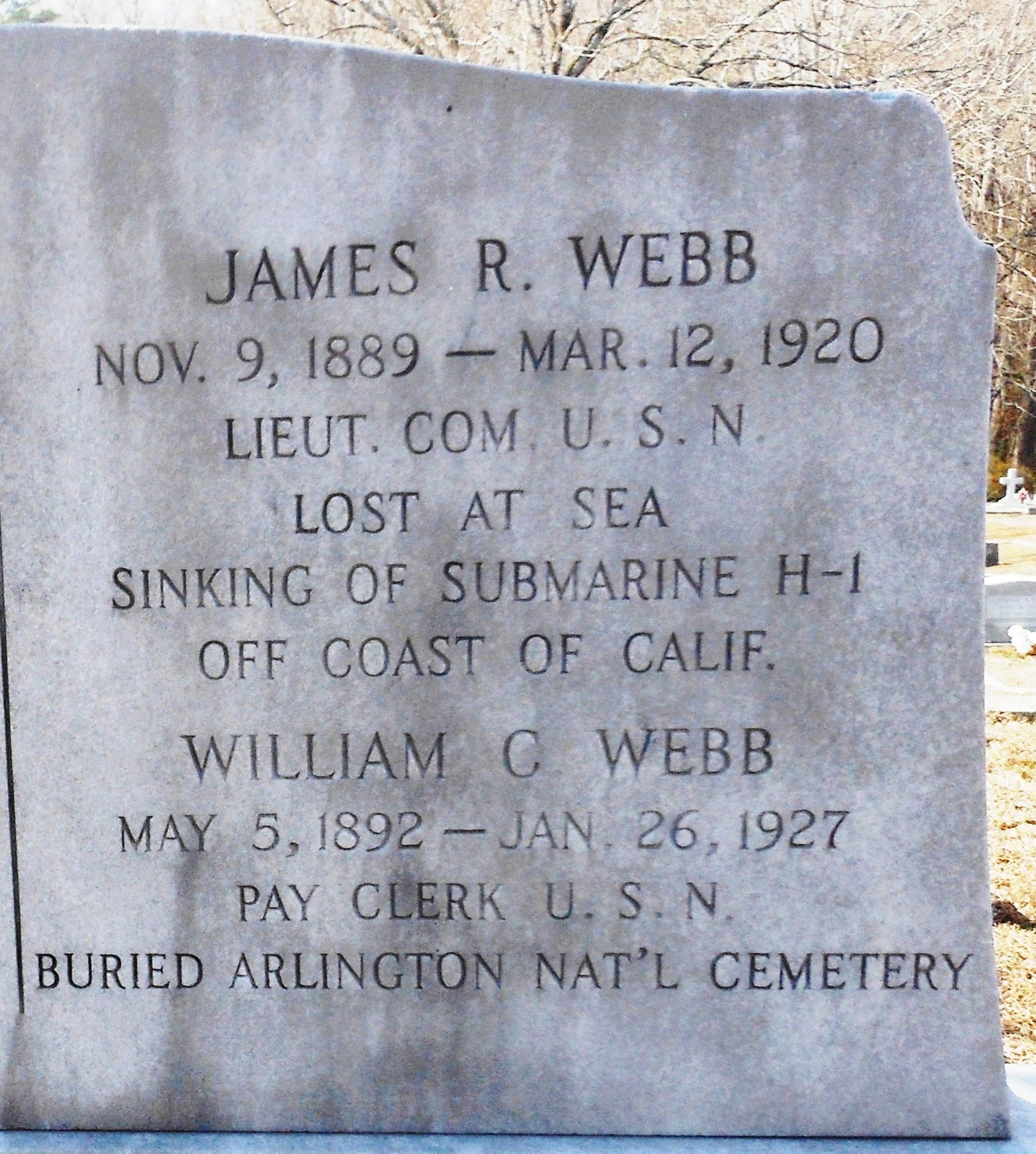 From another news report: Lieut. Commander James R. Webb and three members of his crew were lost when the United States submarine H-l went aground at the entrance to Magdalena Bay, lower California, according to a radio dispatch received here. Besides Lieut. Commander Webb, those listed as dead were H. N. Gilles Machinist mate; M. H. Delarmarine and Joseph Kaufman, seamen. The bodies of two of the men were reported to have been buried by the survivors in the beach of Santa Margarita Island, in the mouth of Magdalena Bay, about 650 miles south of San Diego.