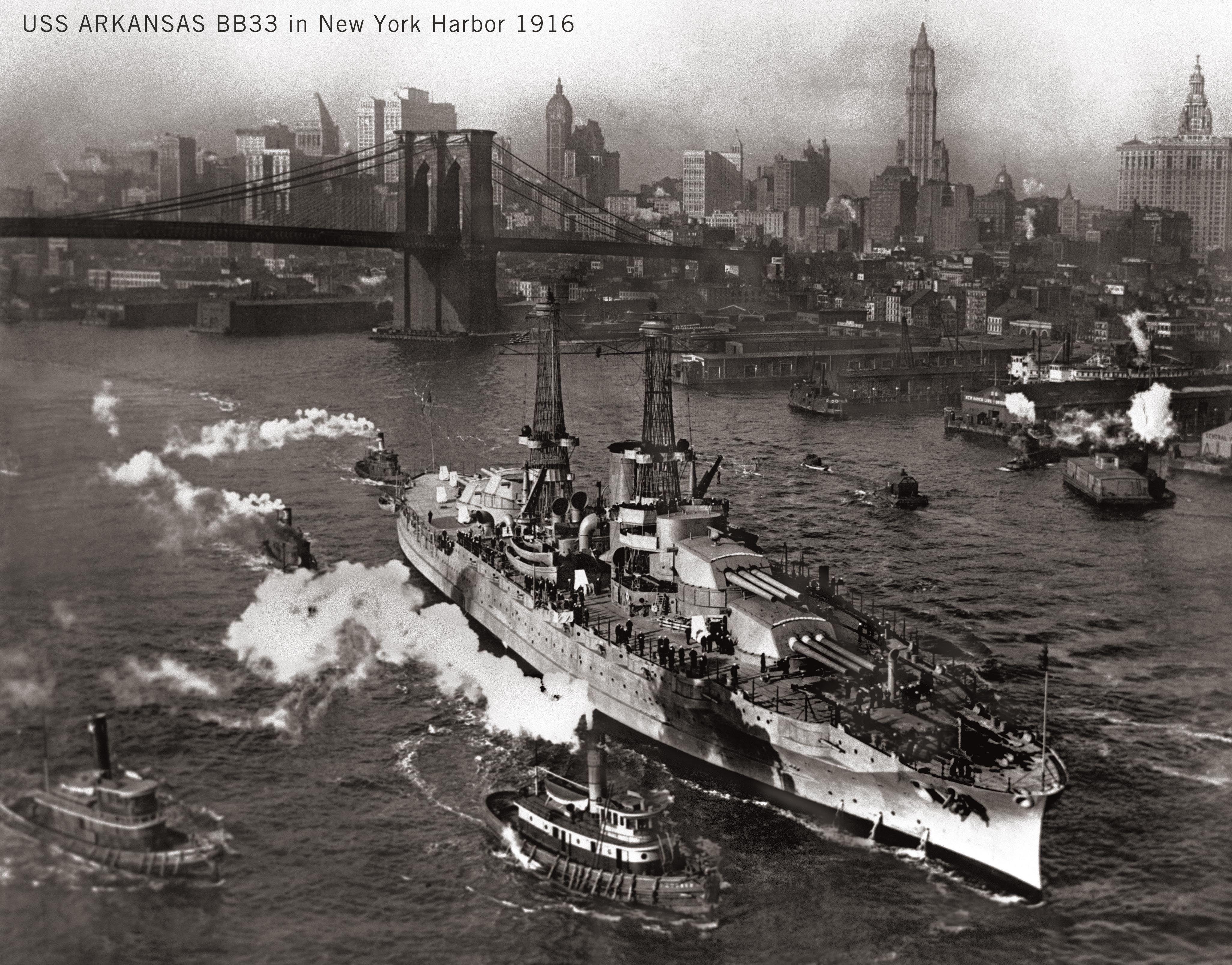 USS Arkansas, a 26,000-ton Wyoming class battleship, was built at Camden, New Jersey. Commissioned in September 1912, she spent her first seven years of service with the Atlantic Fleet. In 1913, Arkansas cruised in the Mediterranean, and in 1914 she participated in the U.S. intervention in Mexico.