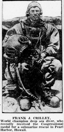 2. Thanks for the post on Frank Crilley. Frank was my great uncle on my Mother’s side Frank served with his brother John and his brother Lawrence, my grandfather. All three were Navy divers. For a time they all served in Newport, RI, together. My grandfather Lawrence served on the USS Narwhal, his Lt and friend was Chester Nimitz.