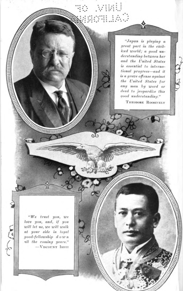 ” There is not time in this message to discuss fully our proper relations to Japan; -but there is always time to point out the elemental fact that this country should feel for Japan a peculiar admiration and respect, and that one of the cardinal principles of our foreign policy should be to secure and retain her friendship, respect, and goodwill. There is not the slightest real or necessary conflict of interest between the United States and Japan in the Pacific; her interest is in Asia, ours in America; neither has any desire or excuse for acquiring territory in the other continent. Japan is playing a great part in the civilized world; a good understanding between her and the United States is essential to international progress, and it is a grave offense against the United States for any man by word or deed to jeopardize this good understanding.