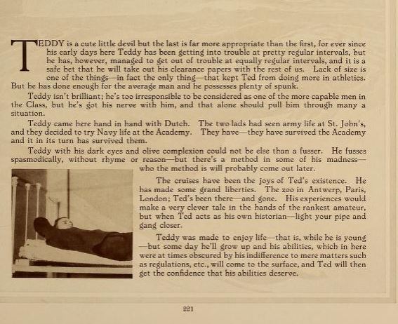 He was admitted as a Plebe from the great state of Wisconsin despite being born and spending much of his life in Washington DC. But the four years would bring him into contact with many young men who came from influential families and his life in the District probably exposed him to all of the trappings of power and politics. Of all the graduates, his name never appeared on the lists of accused for any of the major scandals. His log entry in the yearbook showed that he was no stranger to minor troubles though.