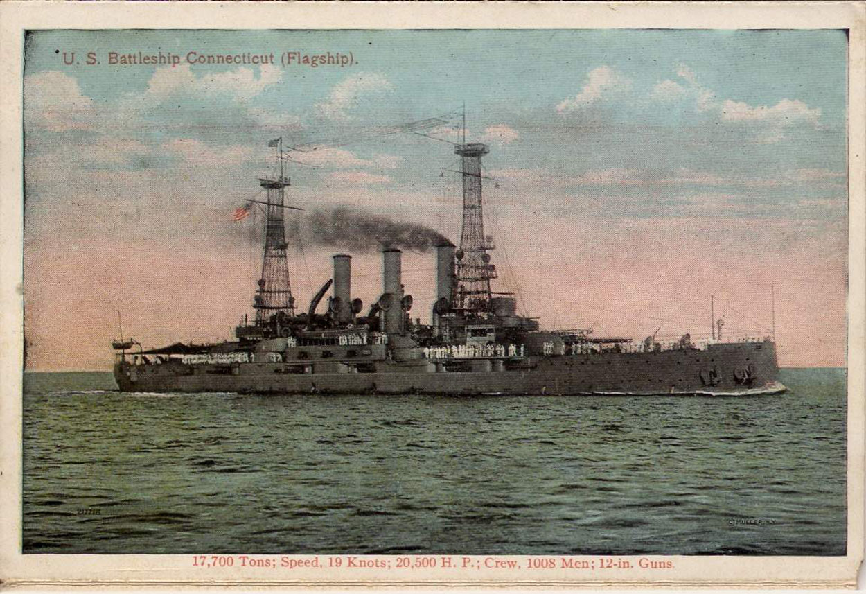 The Connecticut was laid down in March of 1903 and launched with great fanfare in front of thirty thousand people at the Brooklyn Navy Yard in September 1904. Her journeys included a ceremonial trip to commemorate the Landings at Jamestown Virginia and she was the flagship for President Roosevelt’s Great White Fleet that sailed around the world. This cruise demonstrated American power like it had never been shown before and demonstrated the advantages of completing the Panama Canal in easing the way that power could be moved from ocean to ocean more efficiently.