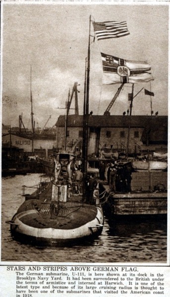 “The surrender of their deadly instruments, such as the submarine, that scorpion of death which sent women and children to their death, was perhaps the most bitter pill of all and when these instruments of warfare are seen at our docks with the American Flag proudly waving over the German Flag it is wormwood and gall to the Hun’s souls. These submarines are being made recruiting stations for our Navy and a large number of young men after going through the deadly boats have at once enlisted in order that the sea may be kept free from German Submarines forever. At present there is one of the largest types at a dock in the Brooklyn Navy Yard. It was surrendered to the British in the terms of the armistice and interred in Harwich England for a time. It is the U111, and because of its large cruising radius is thought to have been one of the submarines that did such deadly work on the American coast in 1918 and for this reason Great Britain gladly permitted it to be shown in this country with the American Flag waving above its periscope. Another spent some time in Baltimore and Annapolis and served as a recruiting office while still others were anchored in Boston and places further south. All these are the latest type and show the large amount of time and money which have been spent on their building and which in the mind of the hated and cruel Von Tirpitz were to win a war for Germany.”