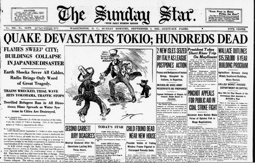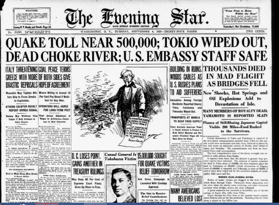President Coolidge addressed Emperor Yoshihito with a message of sympathy on behalf of himself and the American People. “At the moment when the news of the great disaster which has befallen the people of Japan is being received,” the President’s message said, “I am moved to offer you in my own name and that of the American people the most heartfelt sympathy and to express to your majesty my sincere desire to be of any possible assistance in alleviating the terrible suffering to your people.”