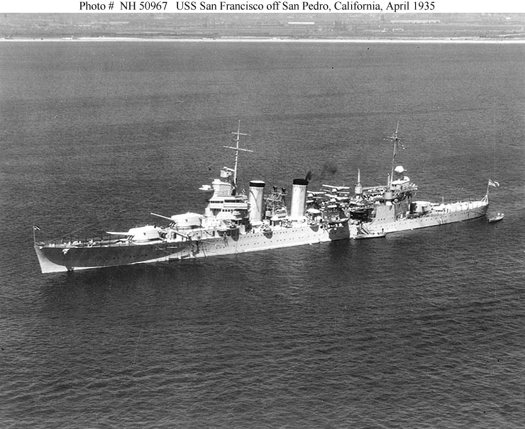 One of those 10,000 ton “Treaty Cruisers” was the USS San Francisco (CA 38) which would be commissioned in 1934. Originally classified as a “light cruiser” because of lack of armor, she was reclassified as a heavy cruiser after the 1930 naval limitations treaty because of her main battery of eight inch guns. The San Francisco was a workhorse for the fleet serving on both coasts up until 1941when she was engaged in operations in the Pacific. She was at the Pearl Harbor shipyard on the afternoon of December 6th with most of her ammunition removed while she waited for needed work on her hull and engineering plant. One of the unique features of the Frisco was that she had been modified in 1935 to serve as a Cruiser Division flagship. This included the addition of living and operation quarters for a Division Officer’s staff.