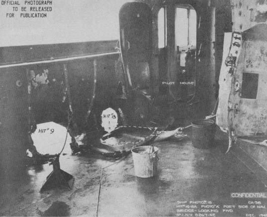 The ship’s secondary command post, Battle Two, was burned out but was reestablished by dark. The after antiaircraft director and radar were put out of commission. Three 20-millimeter mounts were also destroyed.