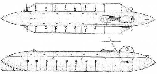 A similar underwater salvage craft was devised by an American named Roman Morhard in 1885. According to plans, air was to enter the interior of the boat from the surface through two small floats connected to the submarine by flexible rubber tubes.