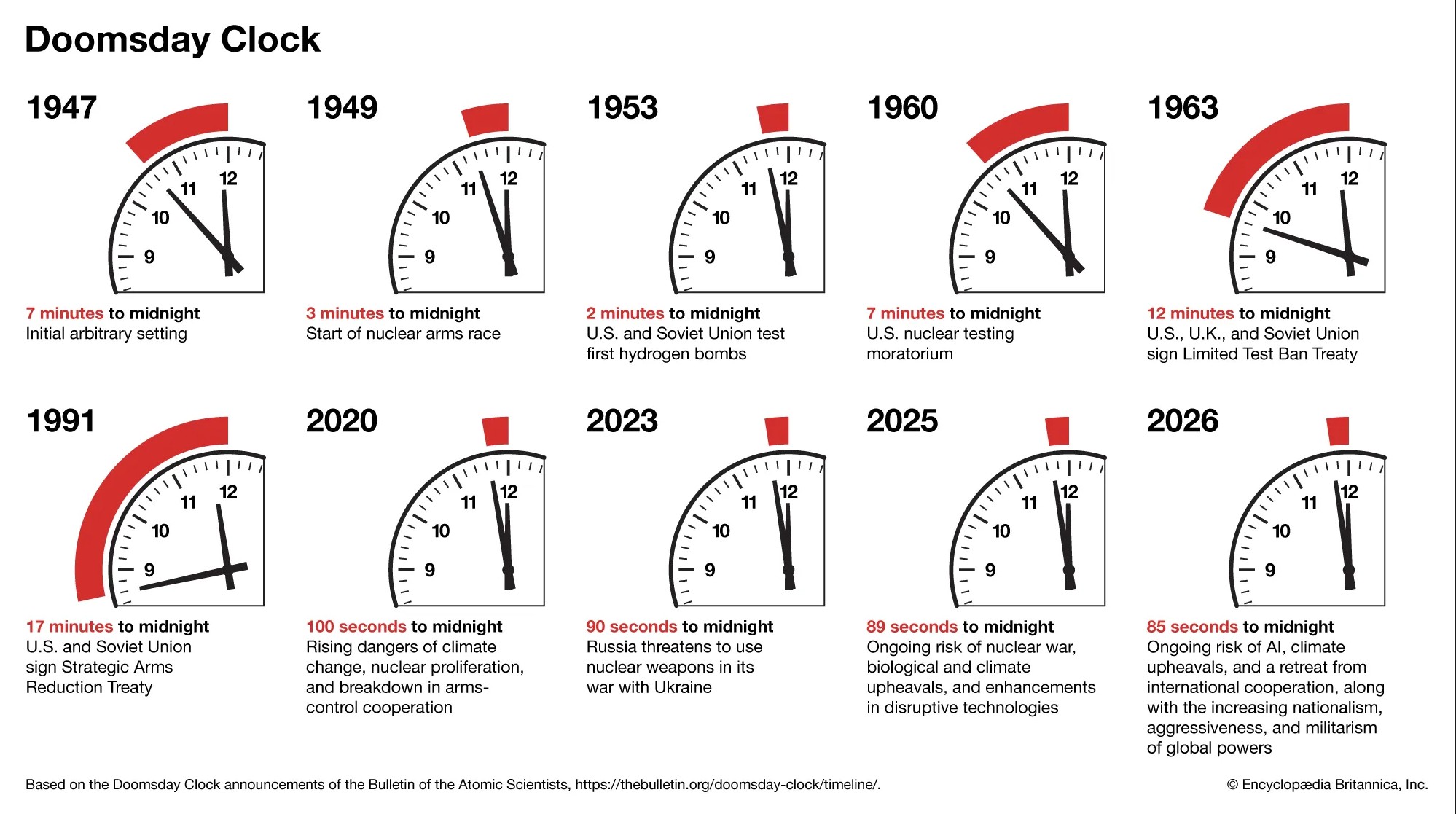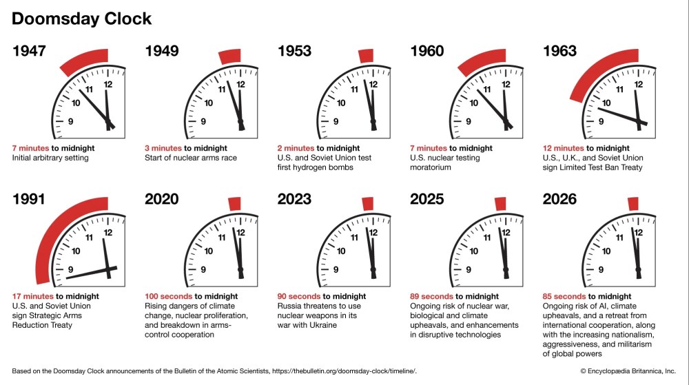 In January 2026 the nuclear clock was set to 85 seconds before midnight, the closest it has ever been to doomsday.