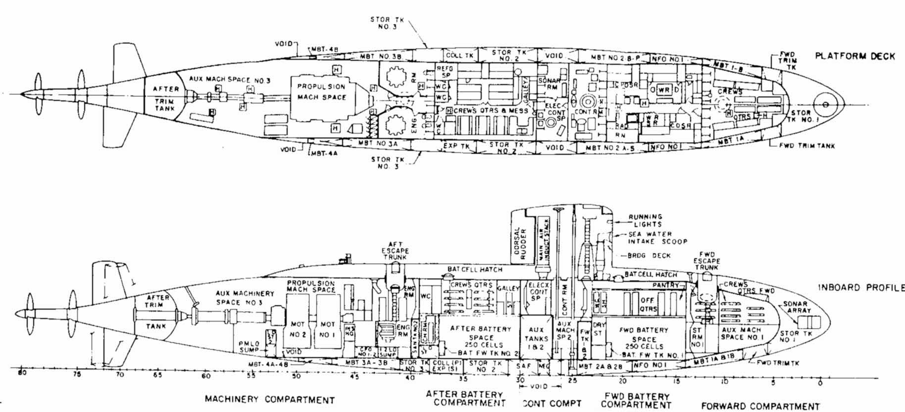 Many detailed design investigations were made consider to the vibration and structural characteristics of these appendages. A conventional diesel electric power plant was specified to expedite construction and reduce cost. The main propulsion components of ALBACORE are similar to those installed on Tang – class submarines. A Guppy – type storage battery is installed. The diesel engines are the lightweight, radial, pancake type. The hydraulic system has an operating pressure of 3,000 p.s.i. and incorporates solenoid – operated remote – control valves. The single large main motor consists of two tandem armatures operating on the same shaft.