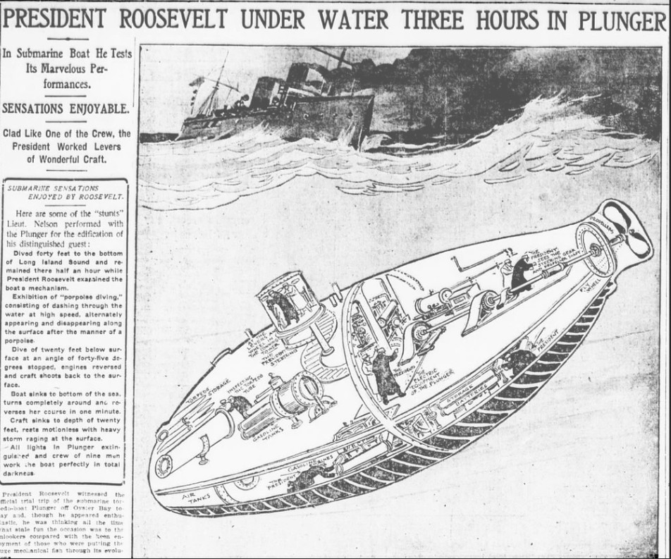The sleek submarines of today are powerful examples of the evolution of naval ship design. What were once awkward frames surrounding the simplest of motive engines, are now the deadliest hunter killers that have ever ranged the oceans deep. The technology to create them largely did not exist when the United States Navy bought her first submersible in 1901 from Mr. Holland. Frankly, the materials used in the Holland were probably state of the art for her day but what we produce now is light years ahead of those pioneering adventures. I can almost hear Teddy Rosevelt exclaim his wonderment if he could step off the Plunger and onto a new Virginia class submarine. With his inordinate curiosity, he would probably slap his thing and yell bully as the new boat performed her own version of porpoising through depths that would crush the first submarine he fearlessly rode.
